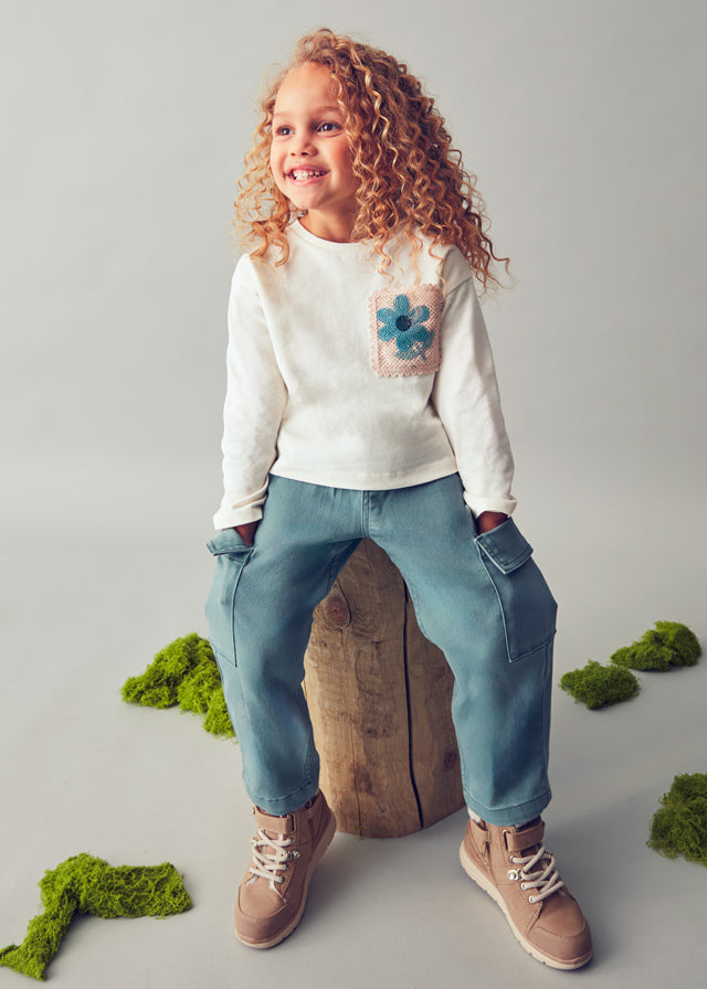 Maglietta bambina Mayoral tasca ricamo fiore verde panna
