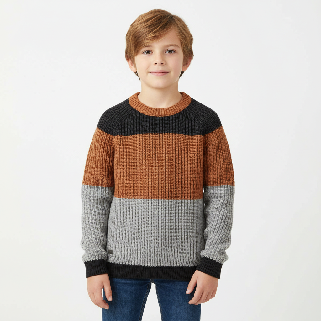 Un maglioncino per bambino dal design moderno, colori grigio, nero e marrone, realizzato in maglieria, perfetto per completare qualsiasi set o look.