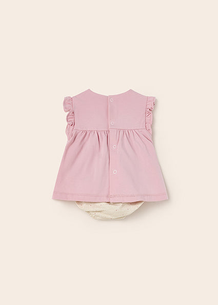 Completo composto da maglietta manica corta per neonata. Chiusura con bottoni a pressione nella parte posteriore che facilitano la vestibilità del capo.