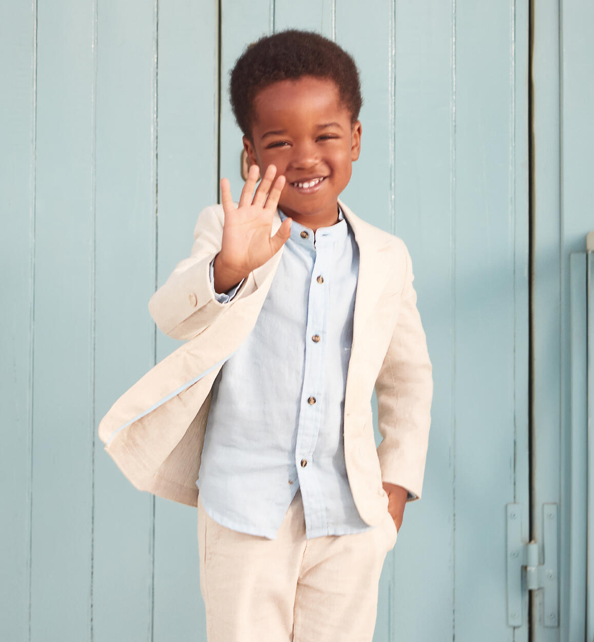 Elegante giacca bambino realizzata in morbido tessuto lino e viscosa stretch. Apertura con bottoni e tasche
