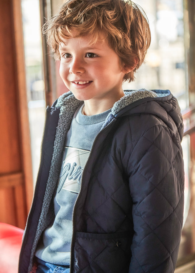 Giaccone manica lunga per bambino. Colletto con cappuccio. Chiusura centrale con cerniera. Tasche funzionali nella parte anteriore. Modello con design reversibile.