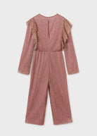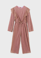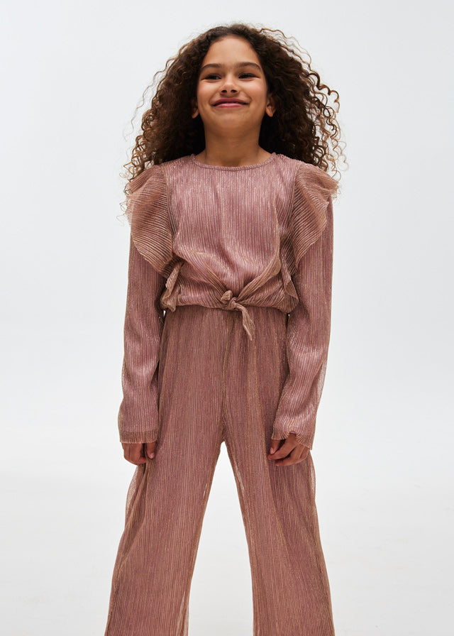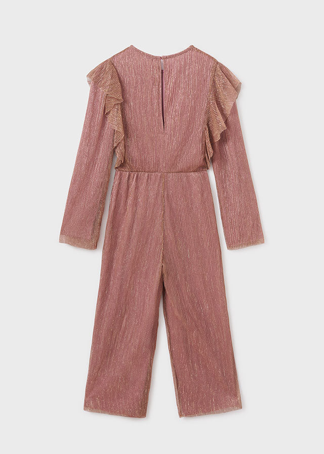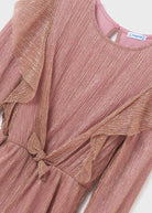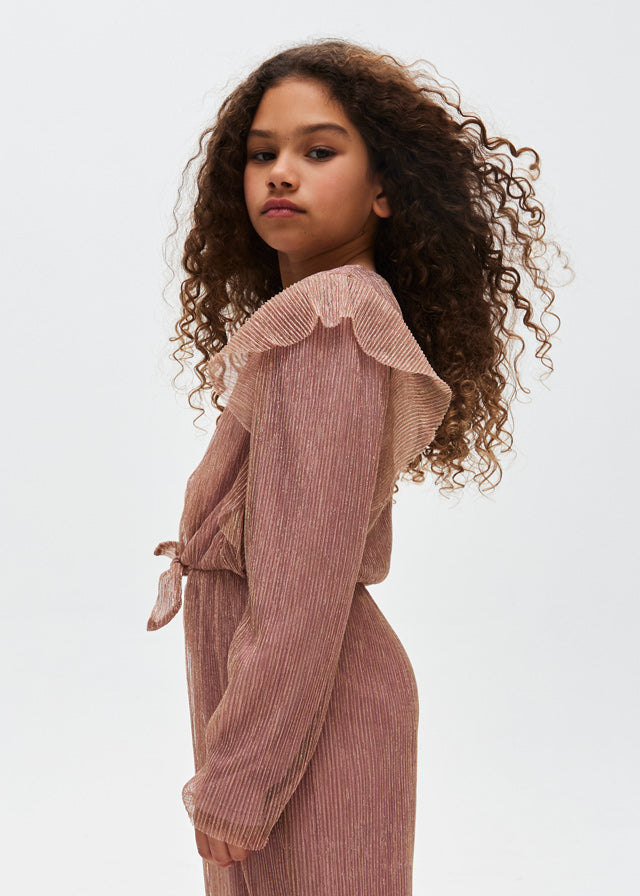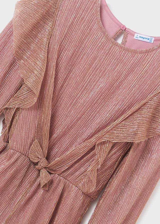 Tuta elegante ragazza di colore rosa lucido e presenta: Maniche lunghe, Collo rotondo, Chiusura bottone sul retro.