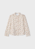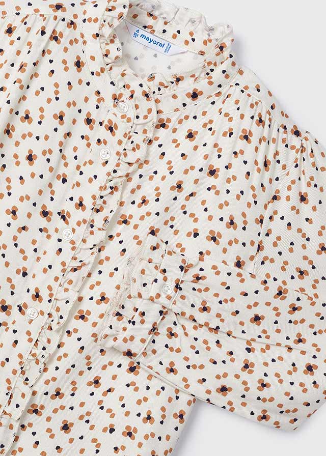 Blusa manica lunga per bambina con volant sul bordo della manica. Girocollo con volant. Chiusura con bottoni nella parte anteriore. Tessuto morbido per una comodità giornaliera. Design stampato.