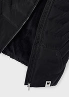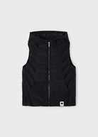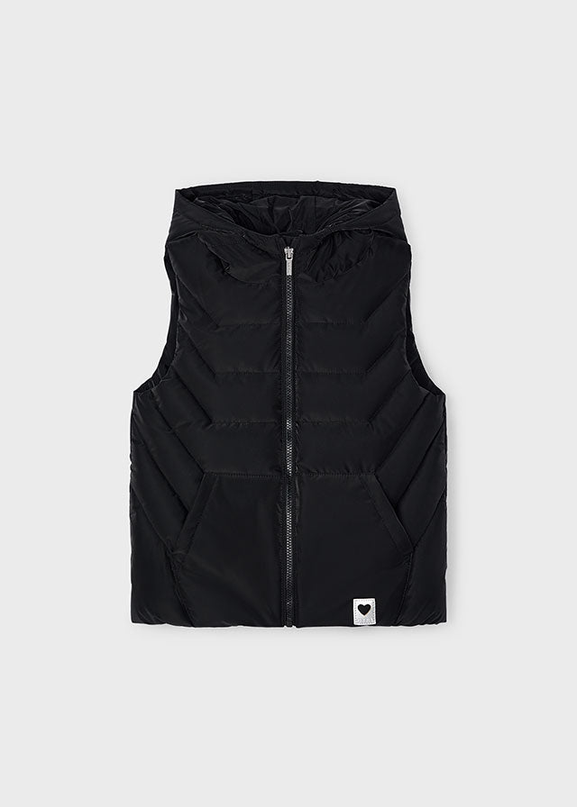 Gilet senza manica per bambina. Colletto con cappuccio. Esterno in tessuto con effetto imbottito. Tasca funzionale nella parte anteriore.