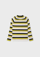 Maglietta manica lunga per bambina. Collo modello lupetto. Tessuto a costine. Trama a righe.