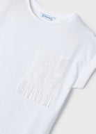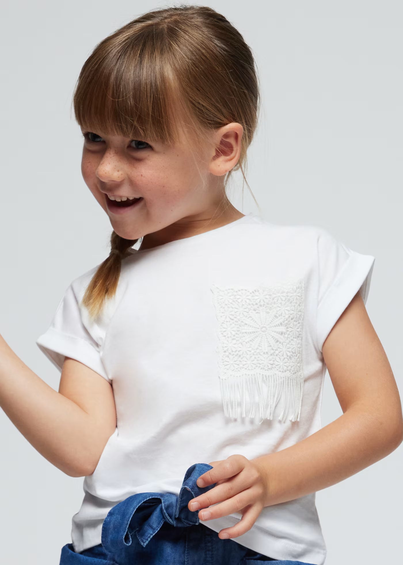 Maglietta manica corta per bambina. Elementi decorativi: frange, bolsillo decorativo. Capo con codice QR della nostra collezione interattiva PLAY WITH. Scansionando il codice QR si accede a un esclusivo videogioco Mayoral.