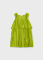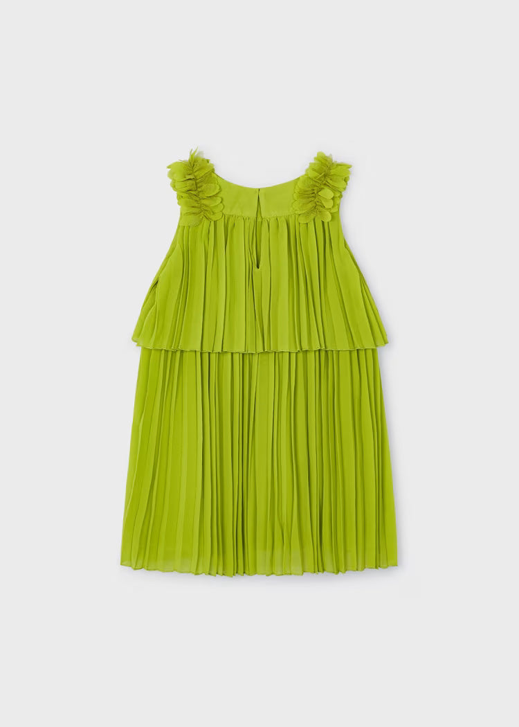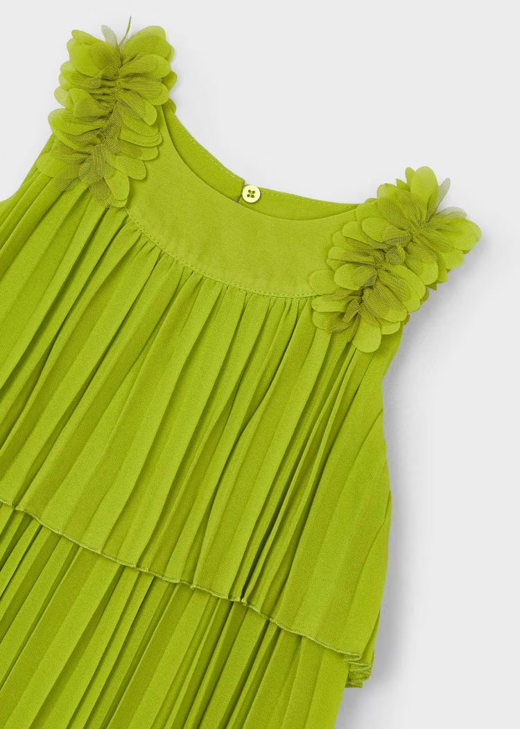 Vestito senza manica per bambina. Chiusura con un unico bottone. Elementi decorativi: applicazioni floreali.