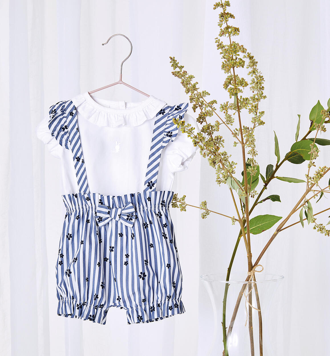 Completo neonata iDO composto da T-shirt e salopette. La T-shirt è in popeline di cotone 100%, il davanti è arricchito da ricami a coniglietto e le maniche sono a sbuffo. Apertura posteriore con bottoni automatici. La salopette è in popeline di cotone elasticizzato con fantasia a righe.