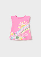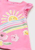 Allegro vestito in fresco cotone stampato per neonata Mayoral Newborn, fantasia arcobaleno e sole in colore Peonia. Morbido, traspirante e confortevole grazie alla composizione in cotone con elastan, ideale per le giornate primaverili ed estive.