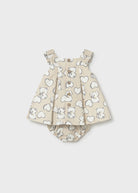 Delizioso vestito stampato con copripannolino per neonata Mayoral Newborn, fantasia cuori e orsetti in colore Beige. Un abito romantico e raffinato, realizzato con esterno in lino e cotone e fodera in cotone, morbido e confortevole sulla pelle delicata della bambina.