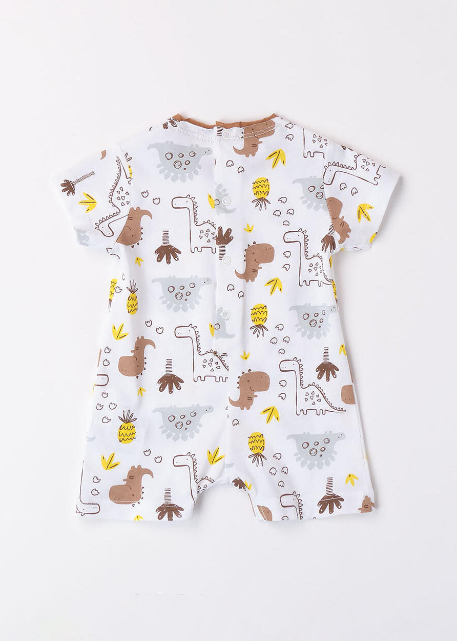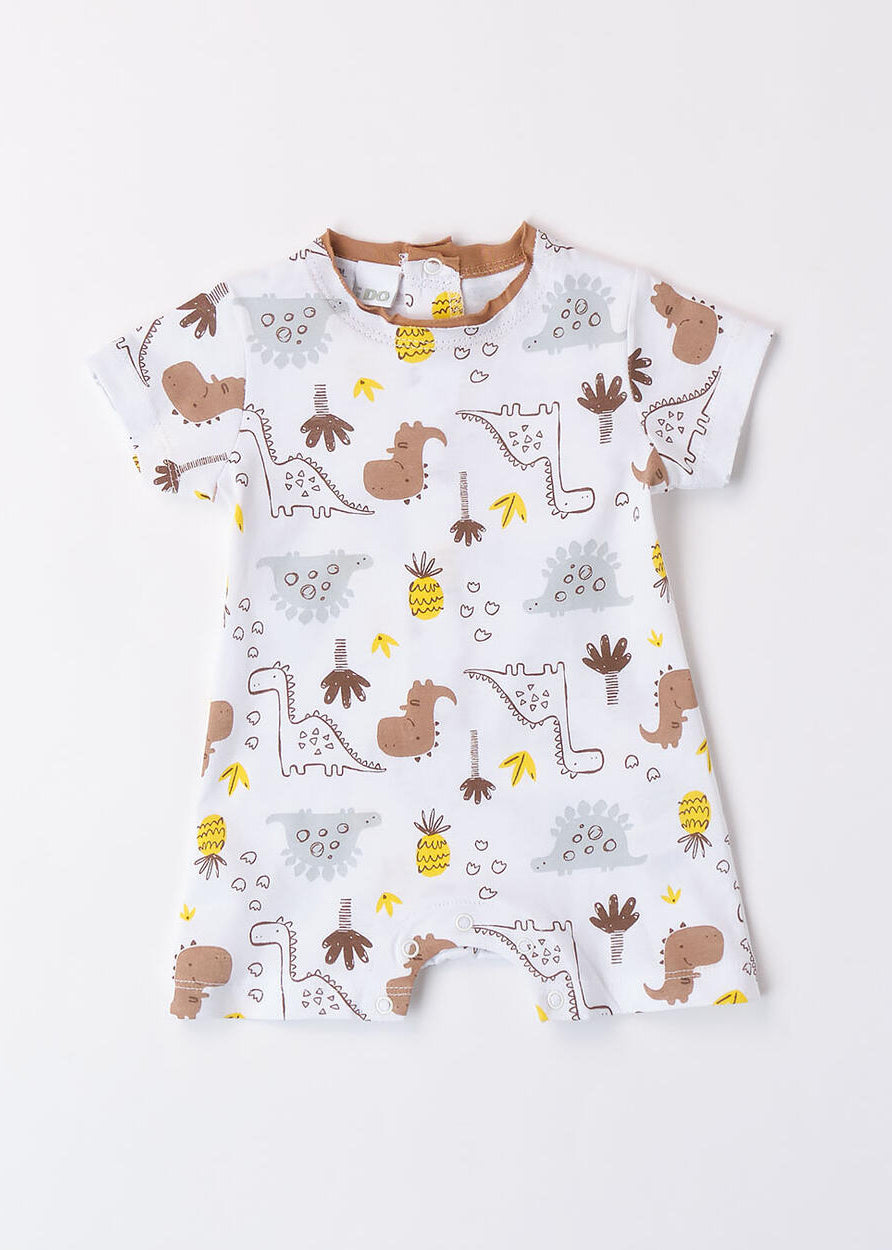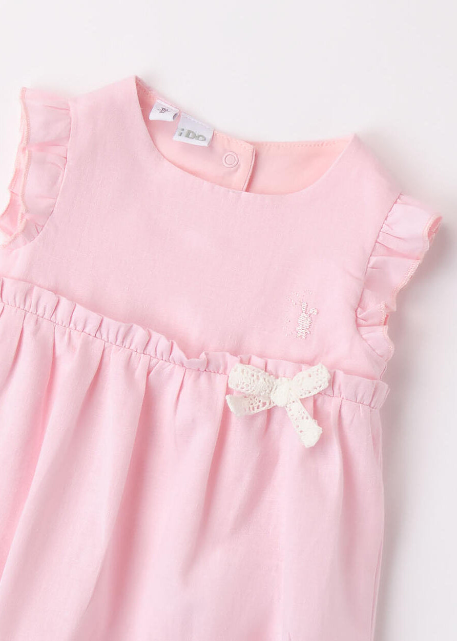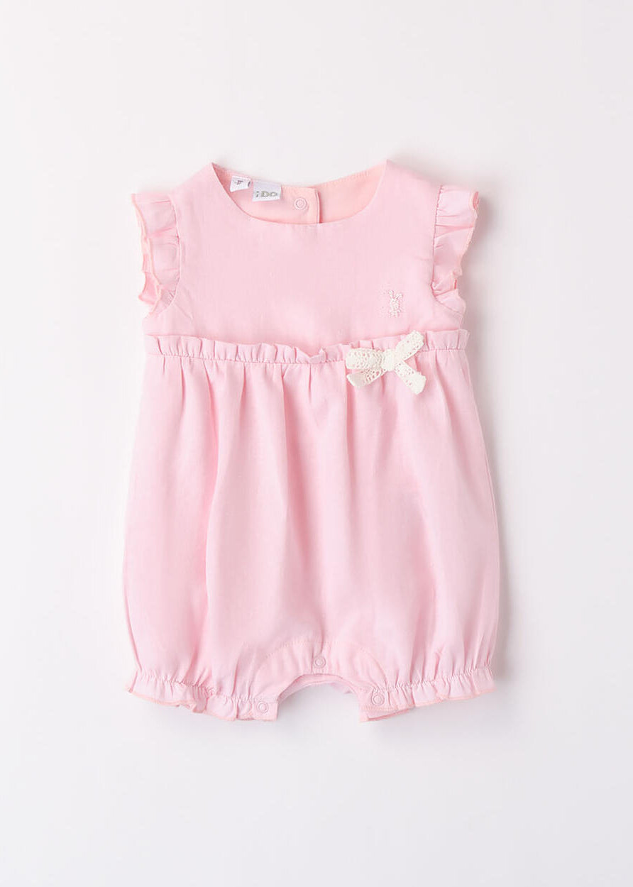 Pagliaccetto neonata iDO in jersey 100% cotone. Nella parte sopra è presente una trama in san gallo, le maniche sono con ruches ed è arricchito da fiocco. Apertura dietro la schiena con bottoni snap e nell'interno cosce per agevolare la vestibilità