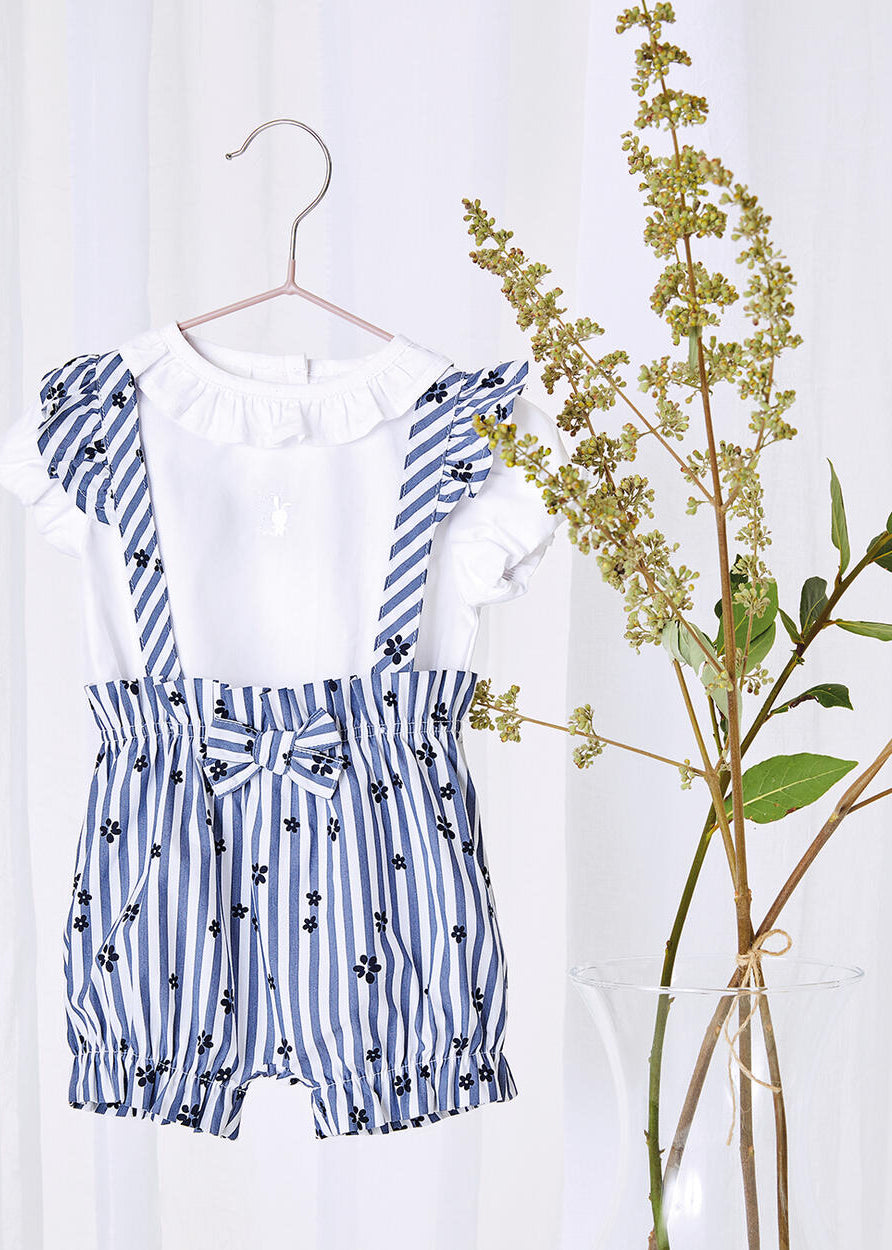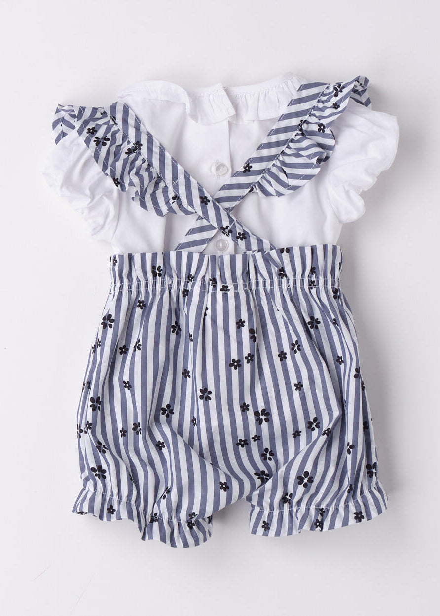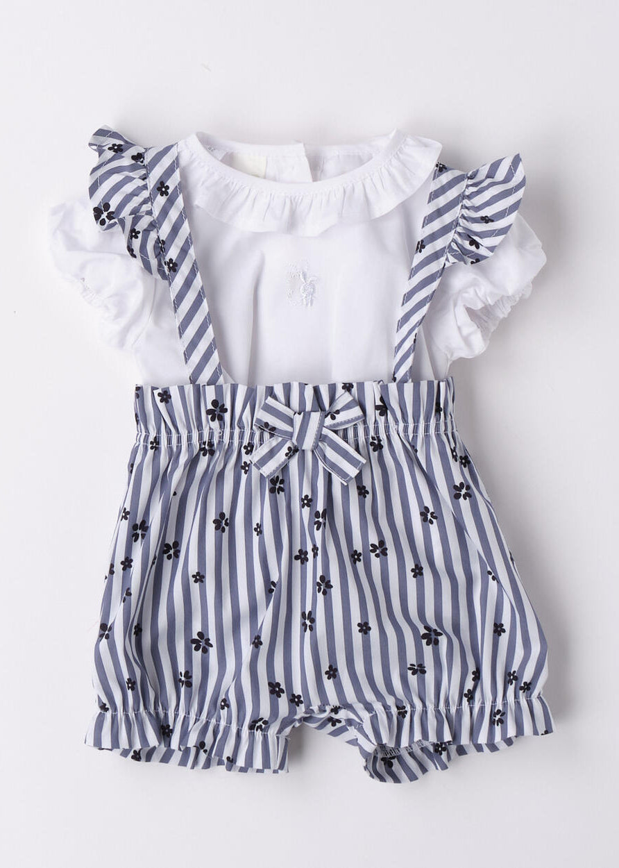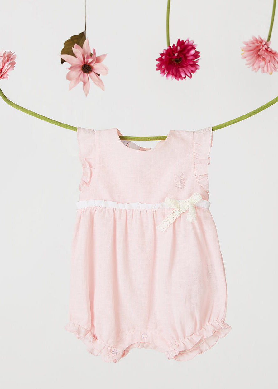 Pagliaccetto neonata iDO in jersey 100% cotone. Nella parte sopra è presente una trama in san gallo, le maniche sono con ruches ed è arricchito da fiocco. Apertura dietro la schiena con bottoni snap e nell'interno cosce per agevolare la vestibilità
