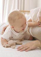 Maglietta manica corta per neonato. Colletto modello camicia. Chiusura con bottoni sulla schiena per facilitare la vestibilità del capo.