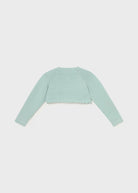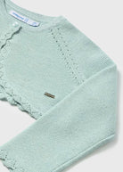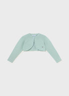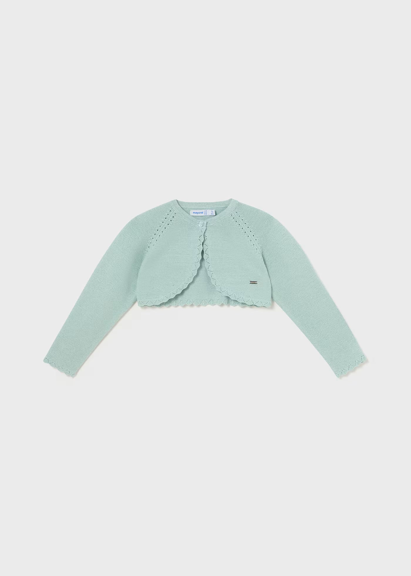 Langarm-Cardigan für Mädchen, ideal passend zu jedem Kleid. Ein-Knopf-Verschluss. Viskose- und Baumwollstoff, weich und angenehm im Griff. Dekorationselemente: gewellter Rand.