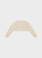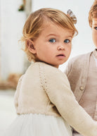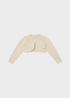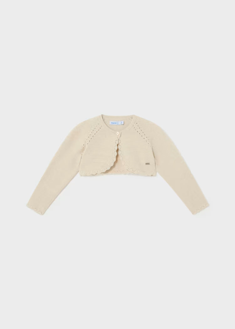 Langarm-Cardigan für Mädchen, ideal passend zu jedem Kleid. Ein-Knopf-Verschluss. Viskose- und Baumwollstoff, weich und angenehm im Griff. Dekorationselemente: gewellter Rand.