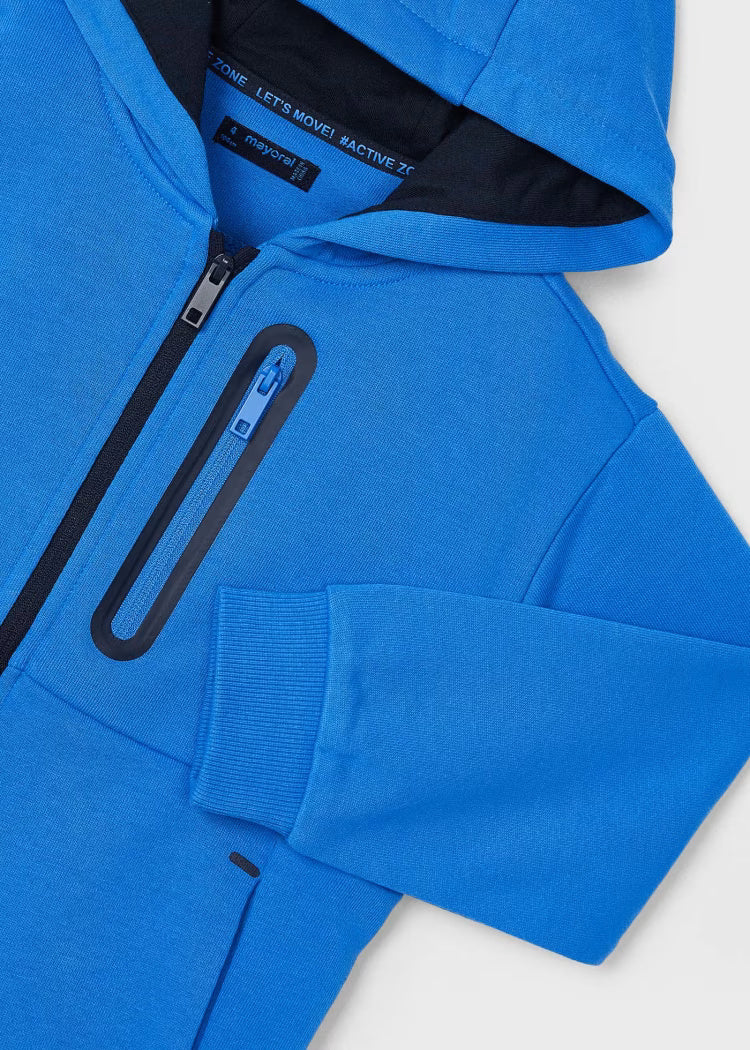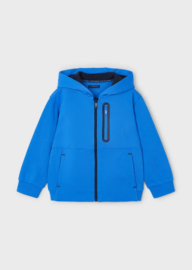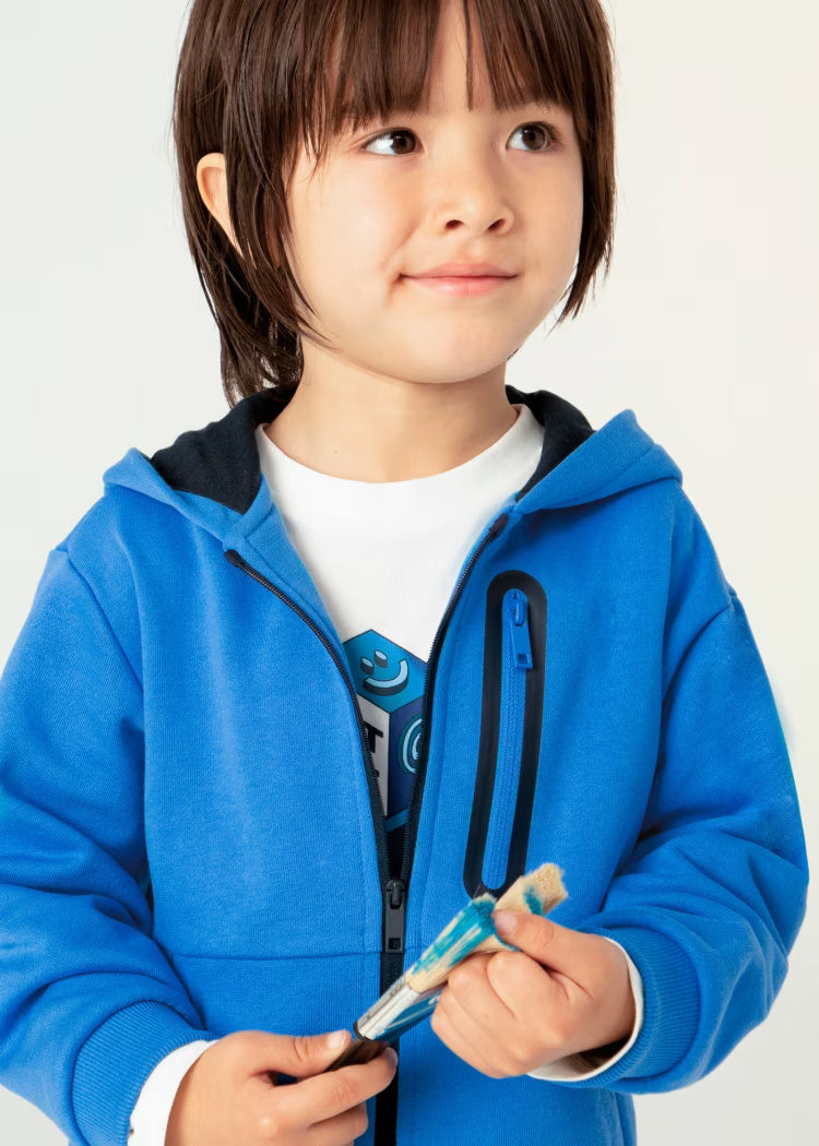 Langarm-Sweatshirt für Jungen mit elastischen Bündchen. Modell mit Kapuze. Elastischer Saum für eine bessere Passform. Funktionelle Tasche auf der Vorderseite. Dekorative Elemente: dekorative Anwendung.