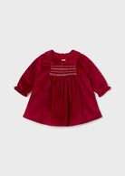 Vestito manica lunga per neonata con volant sul bordo della manica. Apertura posteriore con cerniera invisibile. Confezione in velluto elegante e classico. Questo modello presenta dettagli nido d'ape.