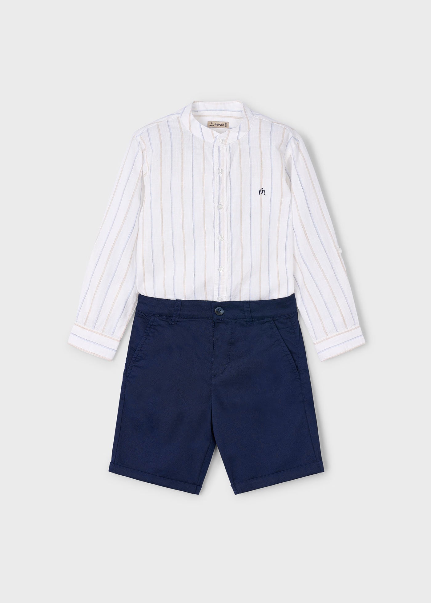 Completo elegante bambino Mayoral camicia righe bermuda blu marino