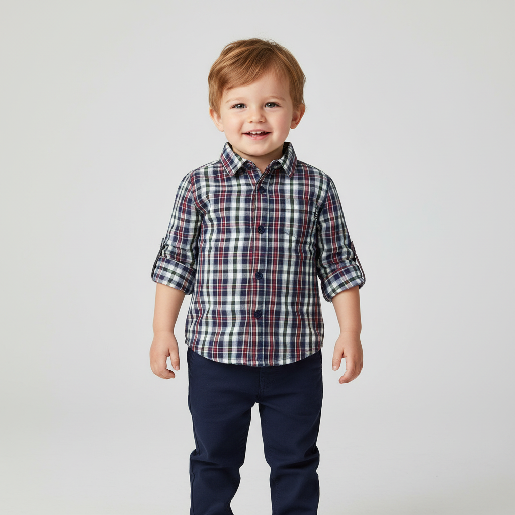 Langarm-Overshirt für Neugeborene. Hemdkragen. Druckknopfverschluss vorne. Stoff aus 100 % Baumwolle. Innenfutter mit Fell. Karierte Textur.
