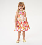 Abito smanicato iDO per bambina da 9 mesi a 8 anni in popeline stretch di cotone con fantasia floreale e fascia in vita realizzata in tulle. Fodera in cotone. Apertura dietro la schiena con zip. Lunghezza al ginocchio