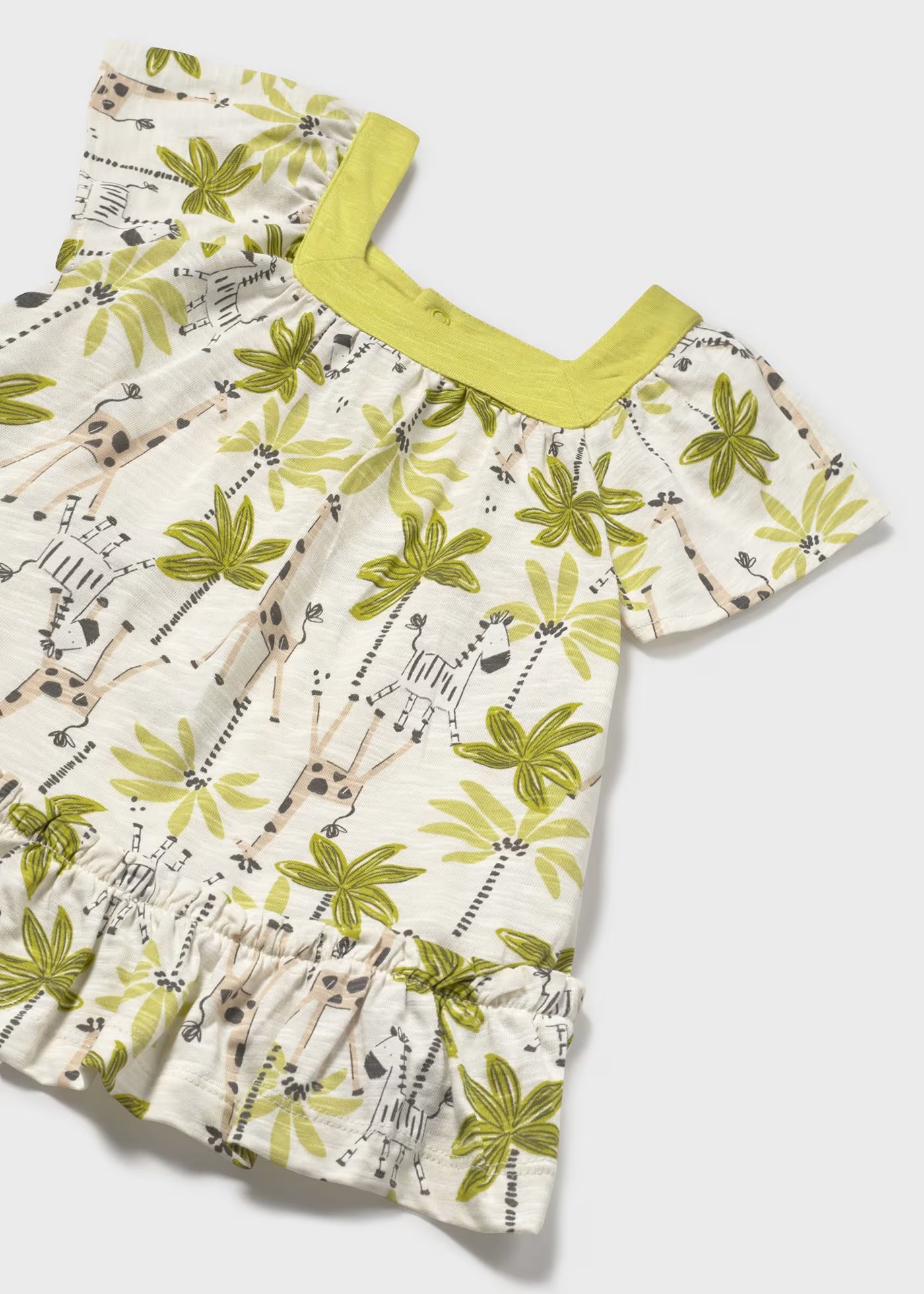 Vestito manica corta per neonata. Colletto quadrato. Tessuto 100% cotone. Modello con riccio. Design con volant nella parte bassa. Design stampato.