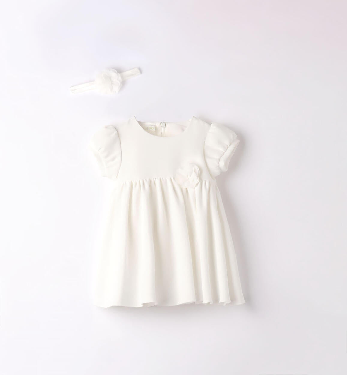 Elegante abito iDO per neonata realizzato in fresco lino al 100%. L'abito è a manica corta, interamente foderato in cotone. La gonna è resa ampia da inserti in tulle. Graziosa cintura in vita con fiore e importante fiocco dietro. Lunghezza sopra al ginocchio. Apertura dietro con zip invisibile