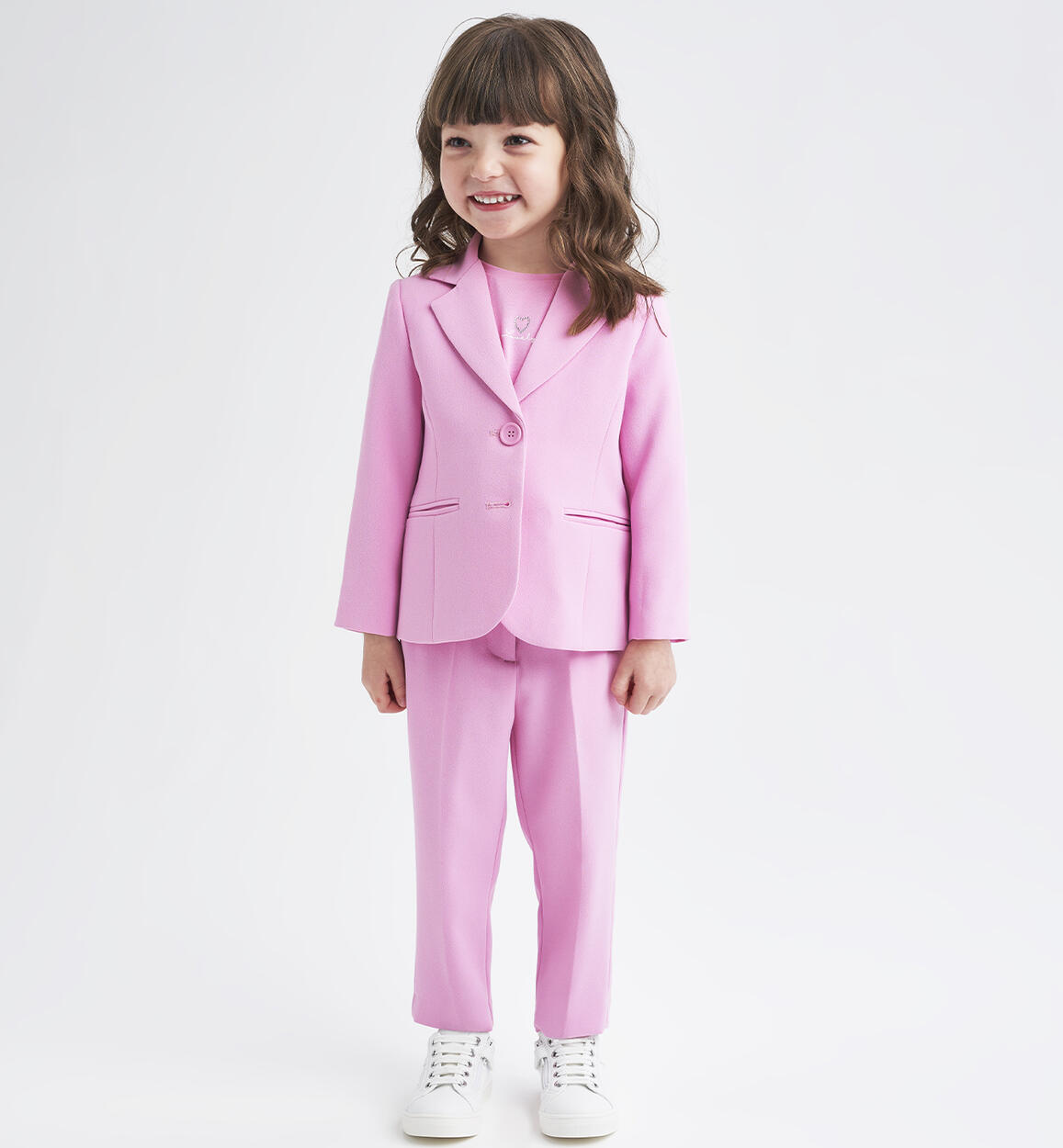 Elegante completo per bambina iDO realizzato in tessuto crepes. La giacca ha apertura frontale con bottoni e finte tasche a filetto. Pantaloni con vita regolabile tramite elastico asolato interno e apertura con zip invisibile.