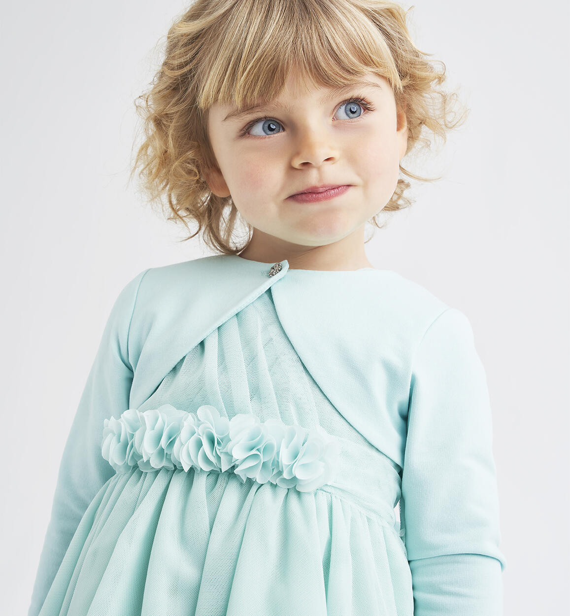 Elegante scaldacuore per bambina iDO realizzato in felpa di cotone stretch con fodera in jersey. Apertura frontale con bottone gioiello.