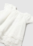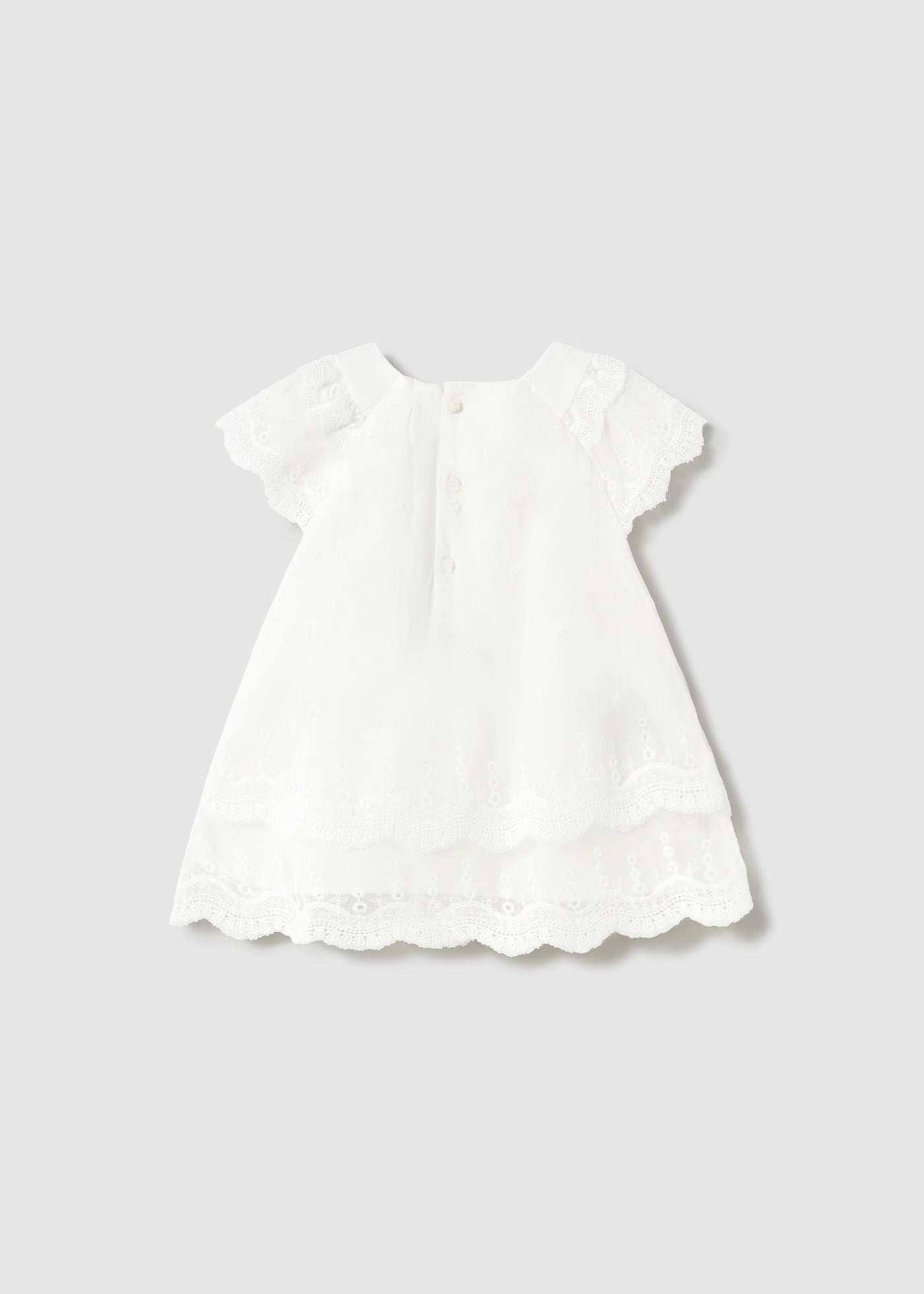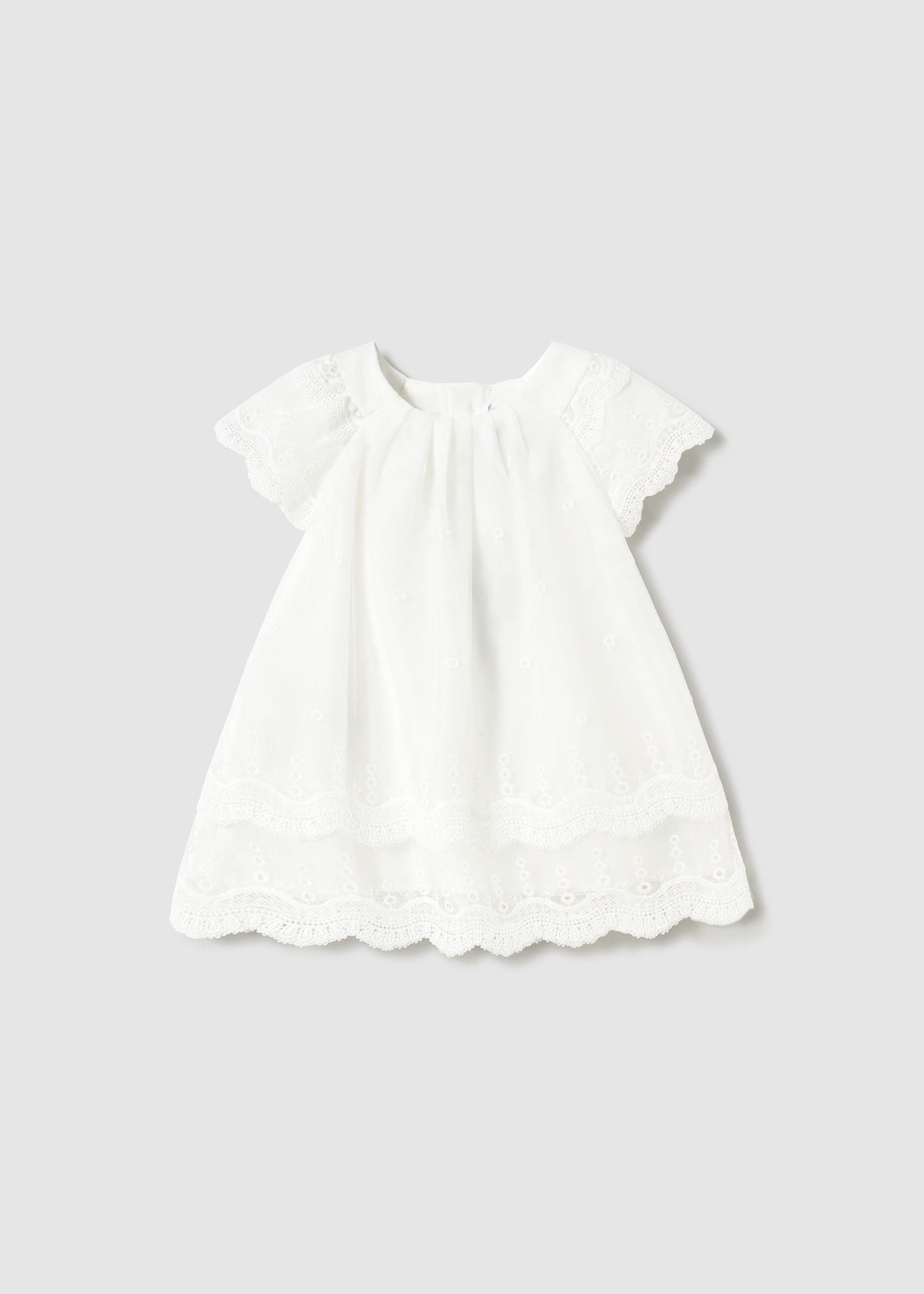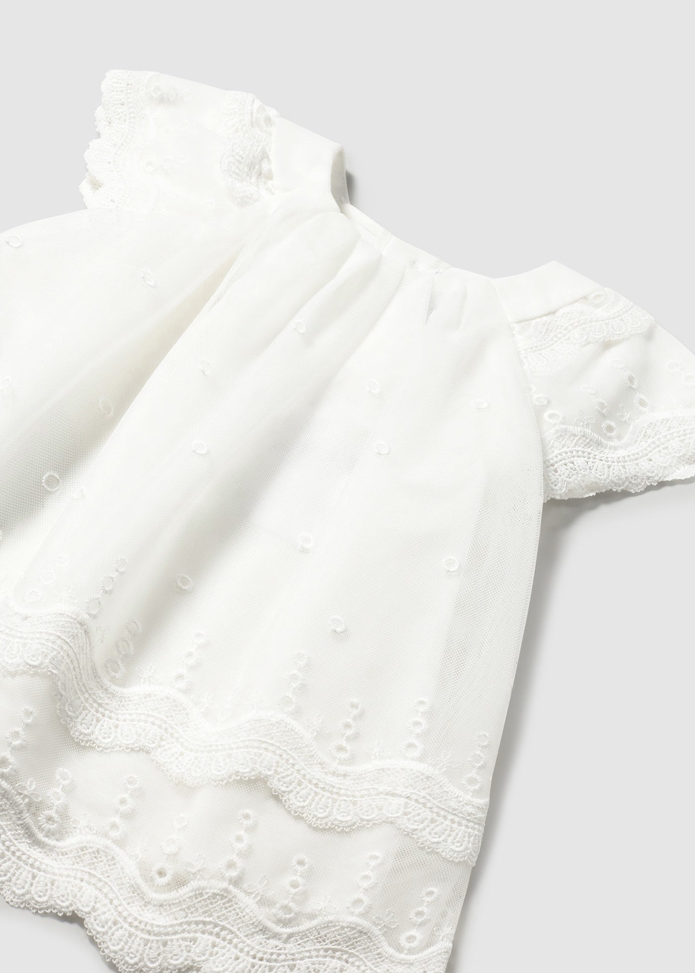 Vestito manica corta con volant per neonata. Modello con scollo a barca. Chiusura con bottoni sulla schiena per facilitare la vestibilità del capo. Confezione in tulle leggero e vaporoso. Modello con fodera interna. Design con volant nella parte bassa. Questo esclusivo articolo appartiene alla collezione Cerimonia ed è stato pensato per ricorrenze, eventi e occasioni speciali.