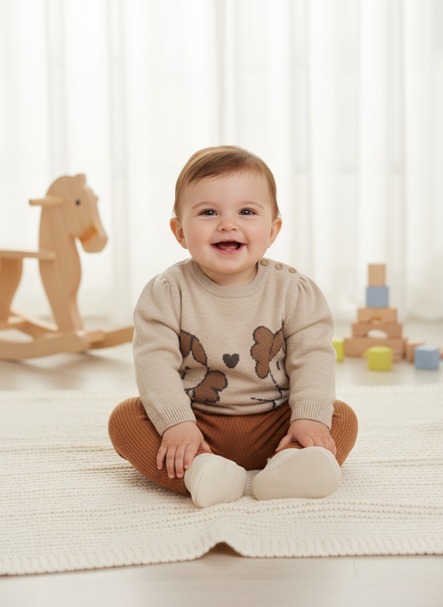 Maglione manica lunga per neonata. Chiusura con bottoni sulla schiena per facilitare la vestibilità del capo.