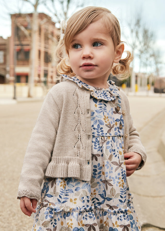 Cardigan manica lunga per neonata. Girocollo. Chiusura con bottoni nella parte anteriore. Tessuto in tricot morbido al tatto. Design con volant decorativo nella parte bassa.