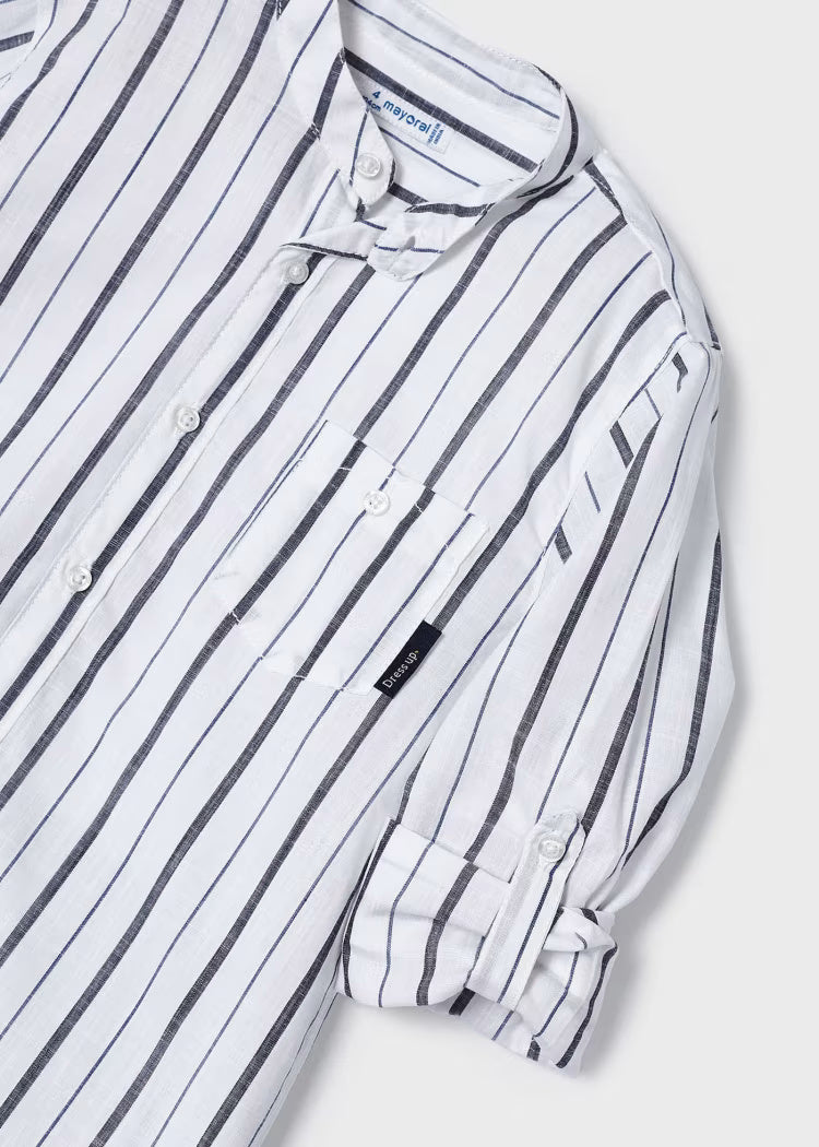 Short sleeve shirt for boys. Model with tone-on-tone mandarin collar. Fresh and modern linen look fabric. Functional pocket on the front.
