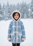 Capotto manica lunga per bambina. Modello con cappuccio. Chiusura con bottoni. Tessuto interno con fodera in pile. Tasche funzionali nella parte anteriore. Trama a quadri.