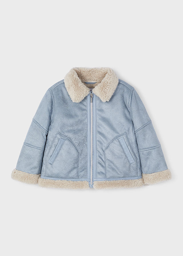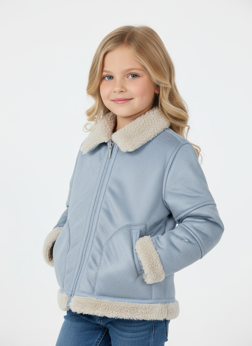 Giaccone manica lunga per bambina. Chiusura centrale con cerniera. Tessuto double-face (non reversibile) con interno in pellicciotto. Tasche funzionali nella parte anteriore.