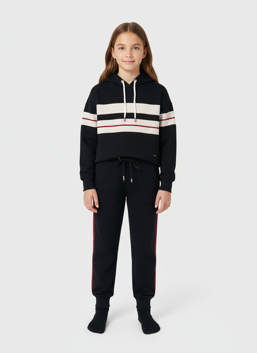 Pantalone per ragazza della linea sporty, molto comodo. Vita elasticizzata con cordoncino regolabile. Orlo elasticizzato per una migliore vestibilità.