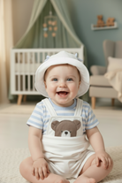 Pagliaccetto manica corta per neonato. Girocollo. Modello con finta salopette sovrapposta. Chiusura con bottoni a pressione nella parte posteriore. Chiusura con bottoni a pressione nell'interno cosce per agevolare la vestibilità. Elasticizzato nella parte inferiore. Morbido tessuto di cotone elasticizzato. Elementi decorativi: ricamo