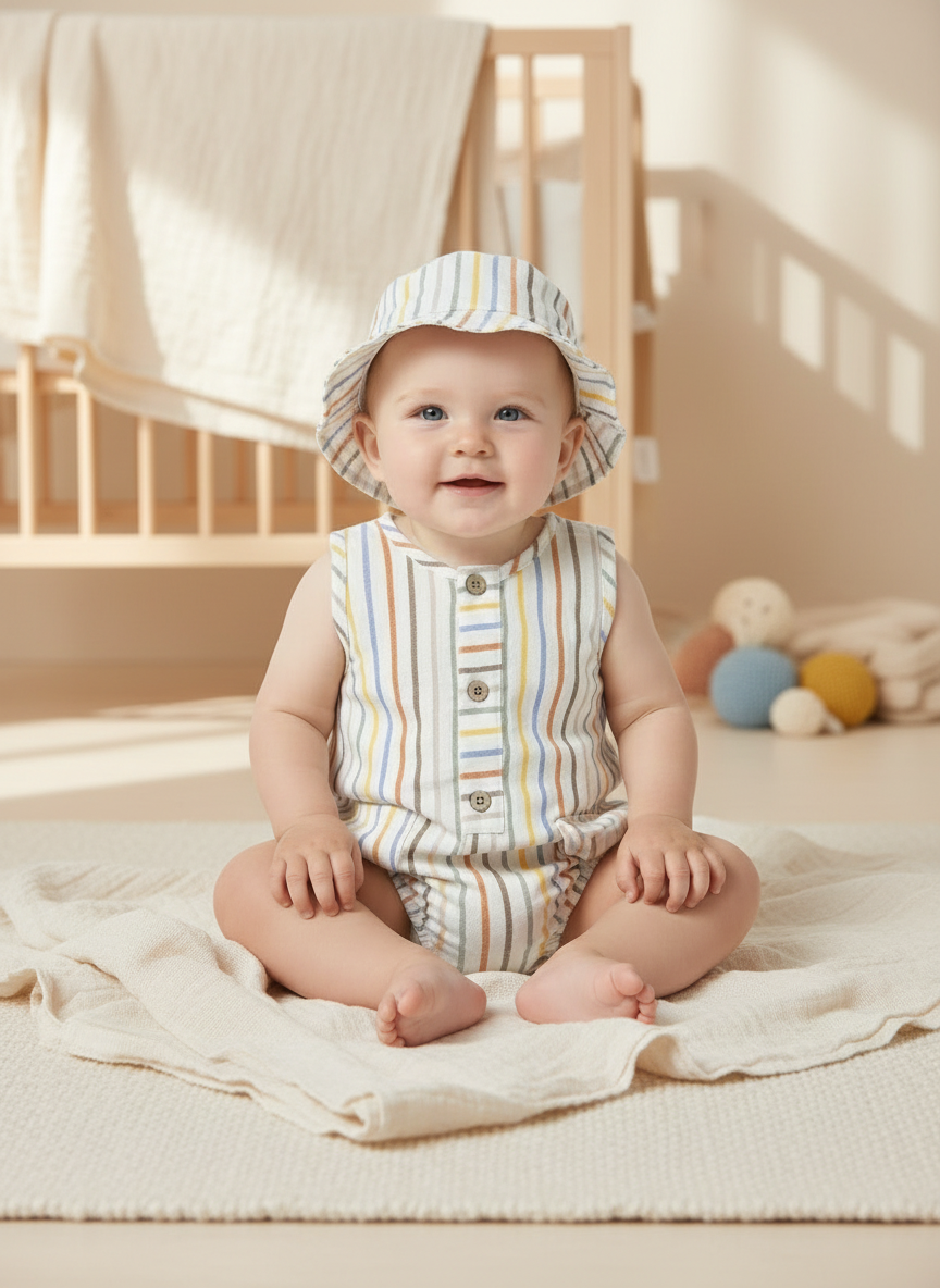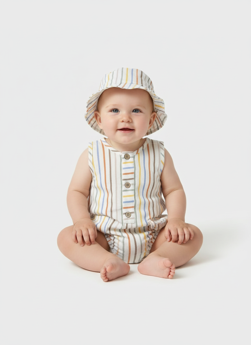 Pagliaccetto smanicato per neonato. Girocollo. Chiusura con bottoni a pressione nella parte posteriore che facilitano la vestibilità del capo.