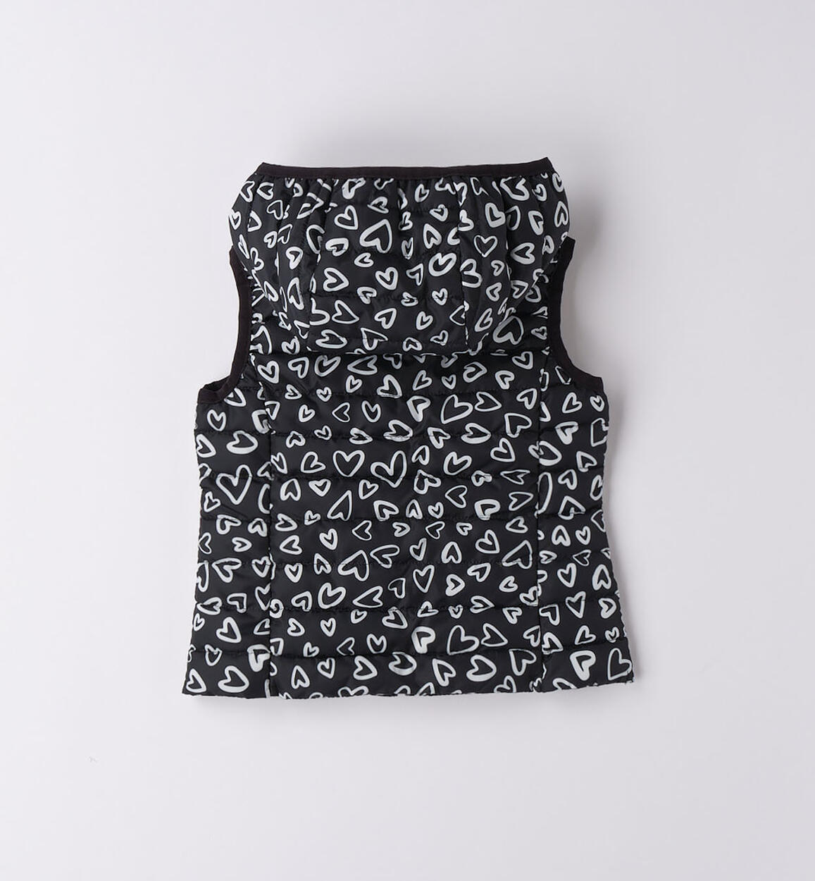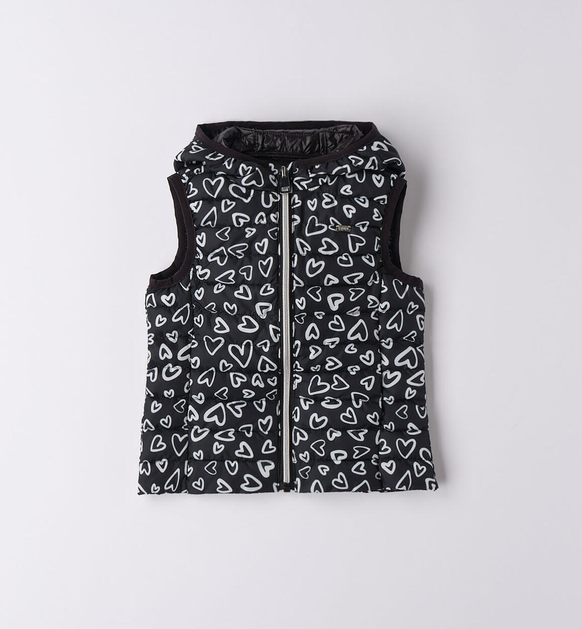 Gilet bambina iDO realizzato in nylon imbottito in ovatta con cappuccio e apertura con zip. Stampa all over di piccoli cuoricini