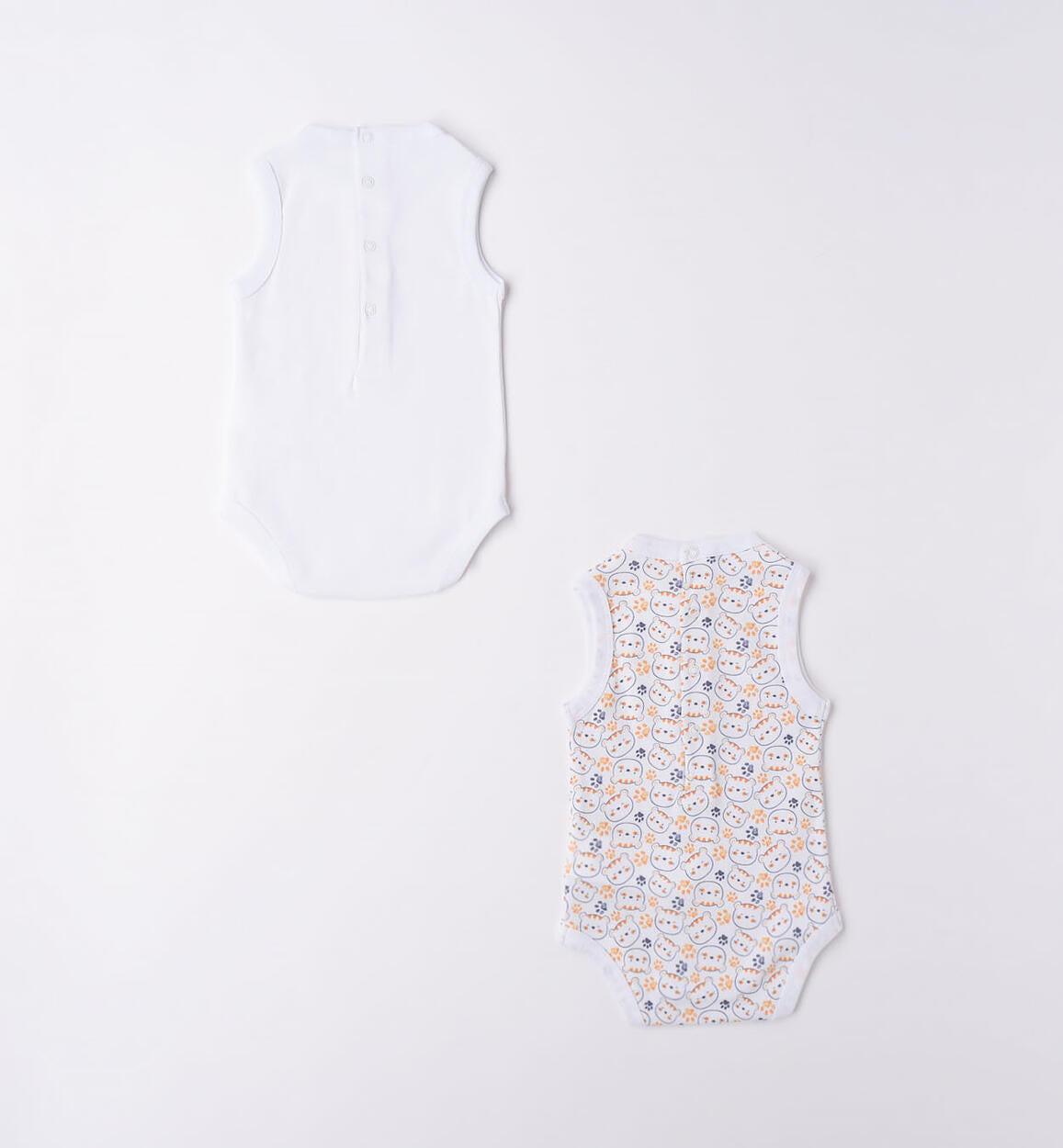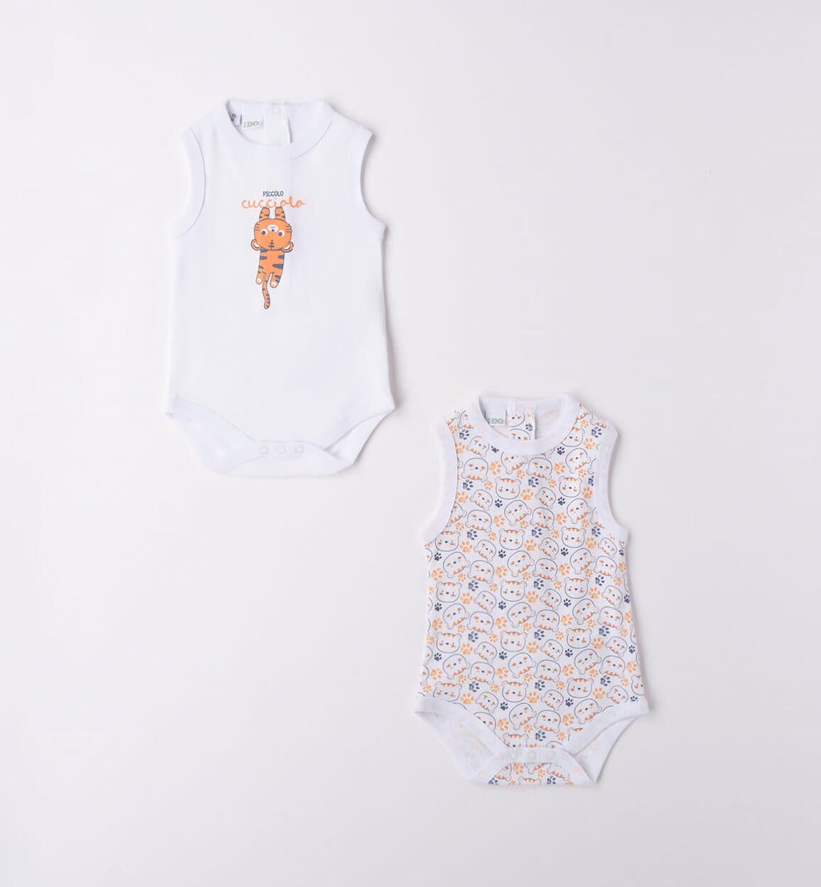 Kit due body smanicati iDO per neonato realizzati in cotone al 100%. Un modello è stampa piccola tigre e l'altro è stampa all over. Apertura dietro e nell'interno cosce con bottoni snap per agevolare la vestibilità