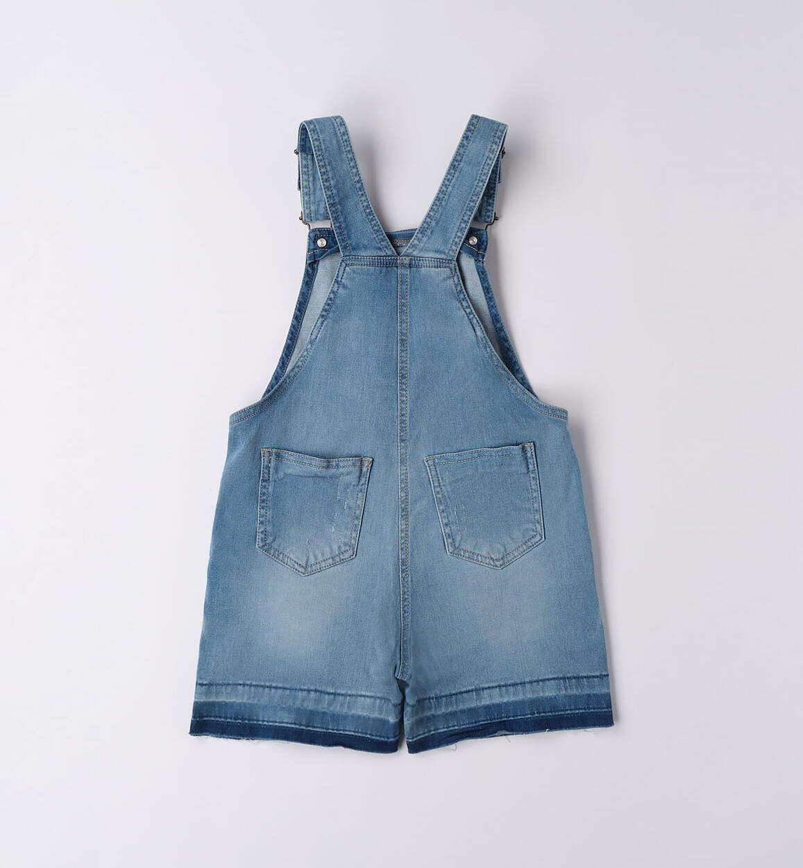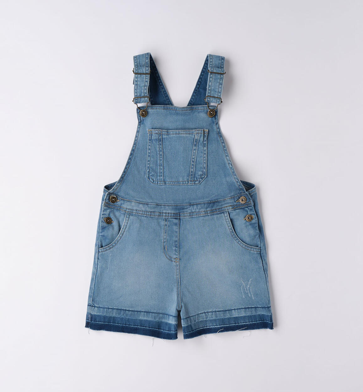 Salopette corta iDO in denim stretch di cotone per ragazza. Fondo sfrangiato